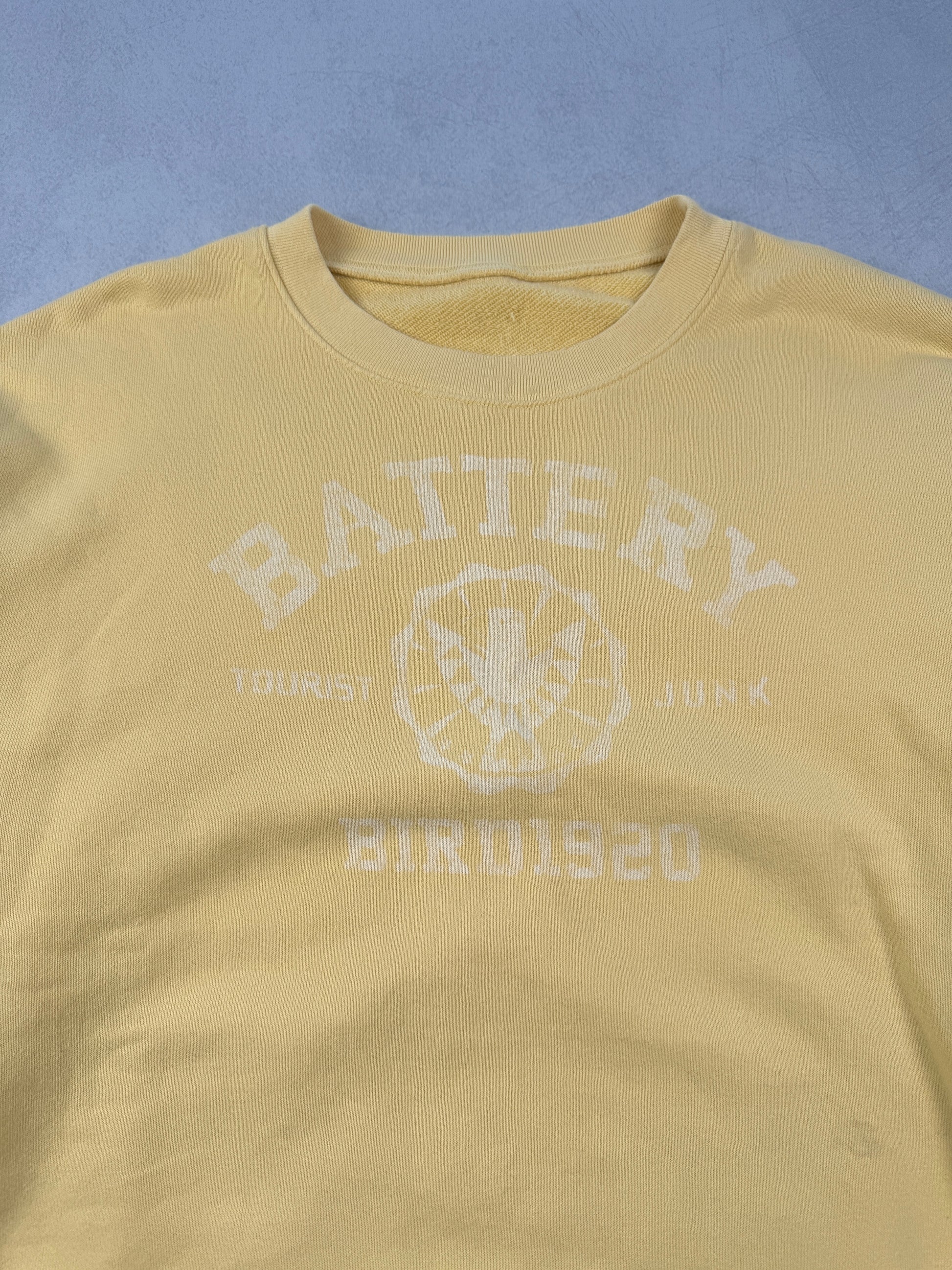 - Faded yellow colorway with vintage-washed chest print reading “BATTERY TOURIST JUNK BIRD1920.”