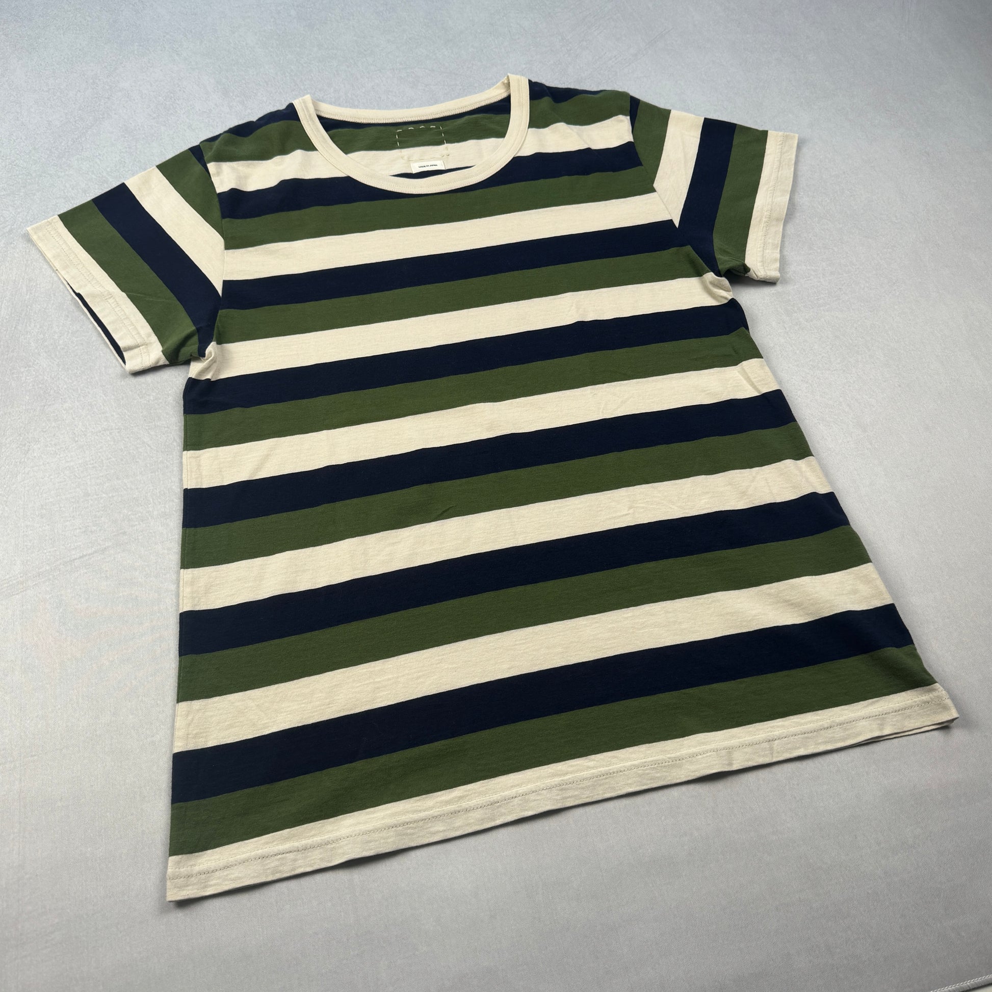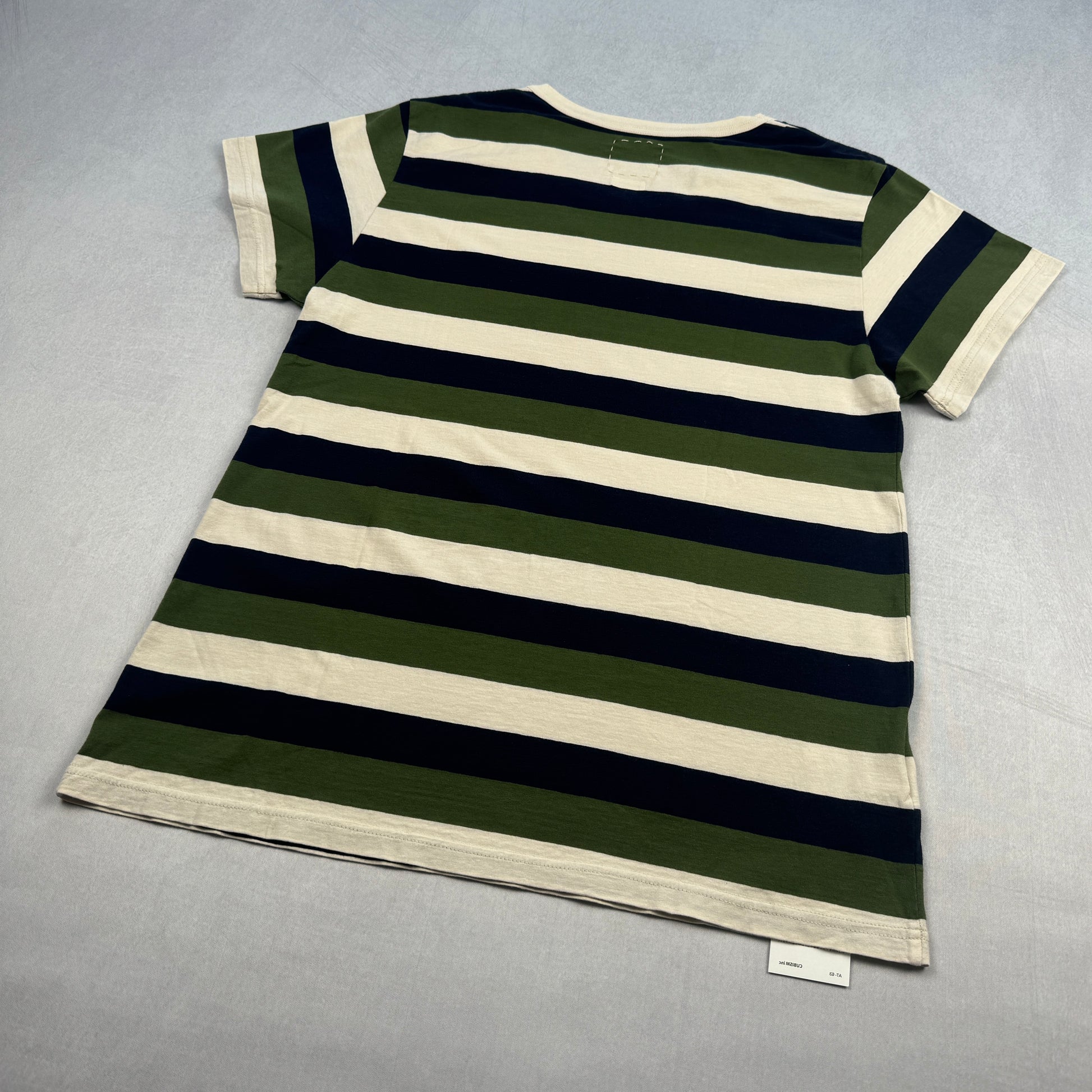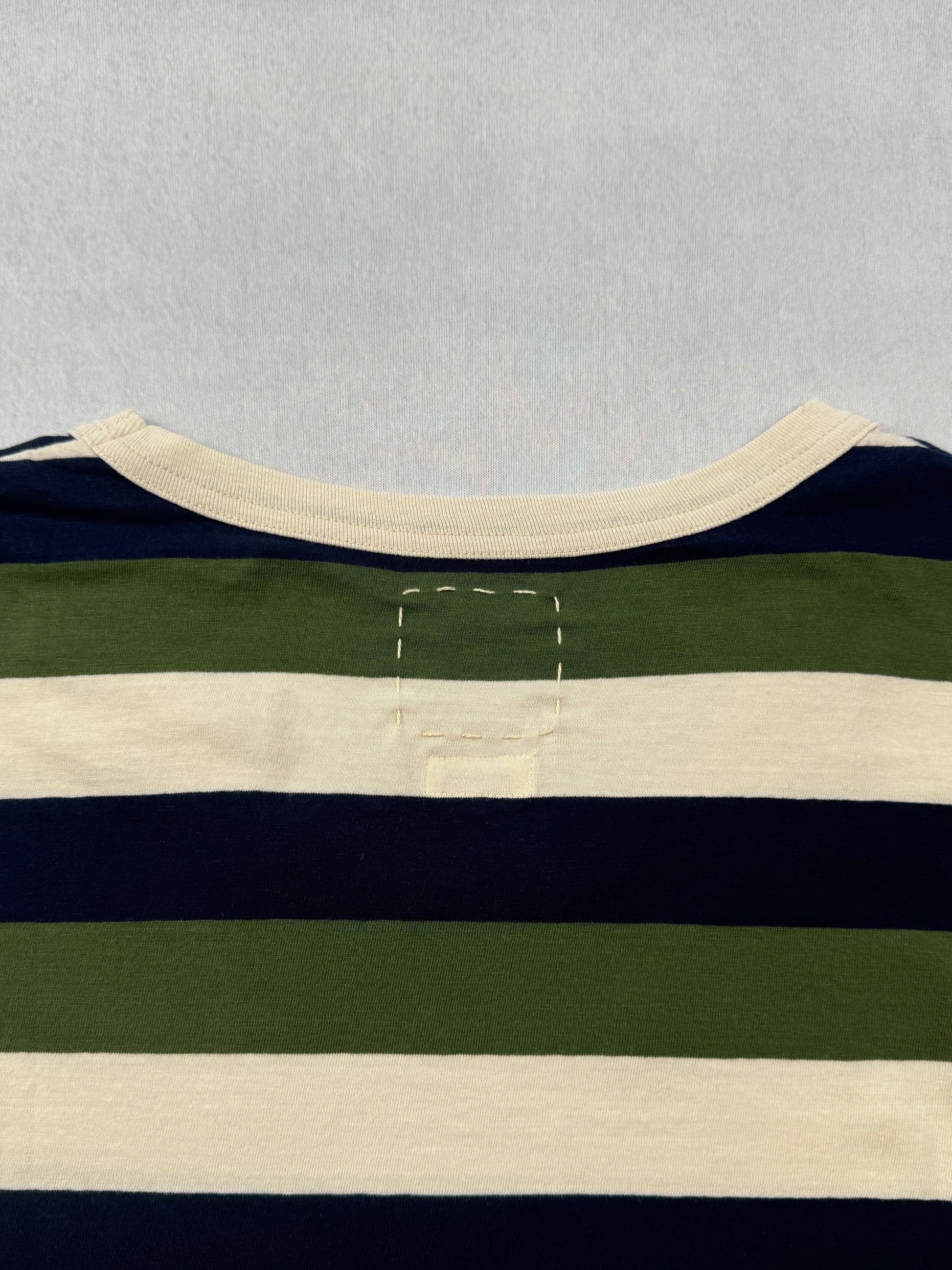 - Cream, olive, and navy wide stripe pattern with a soft garment-dyed finish and classic crewneck.
