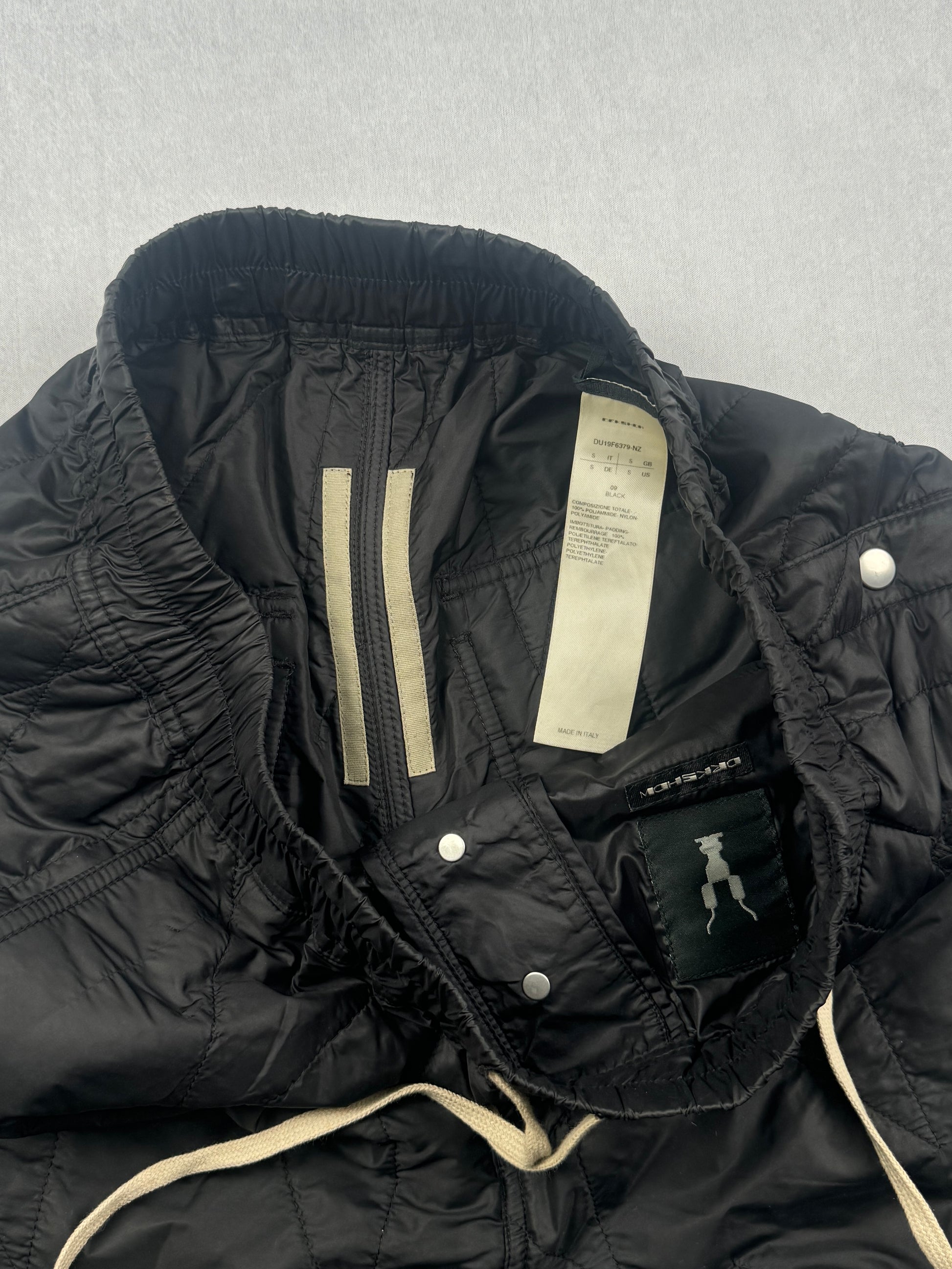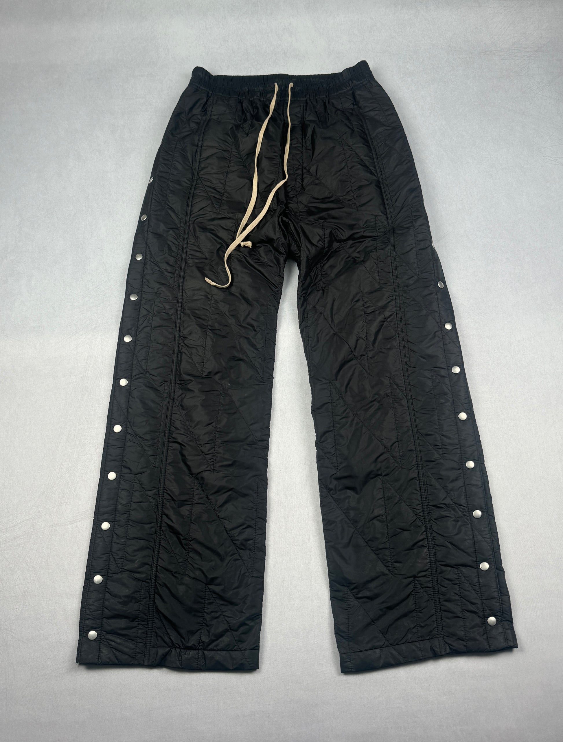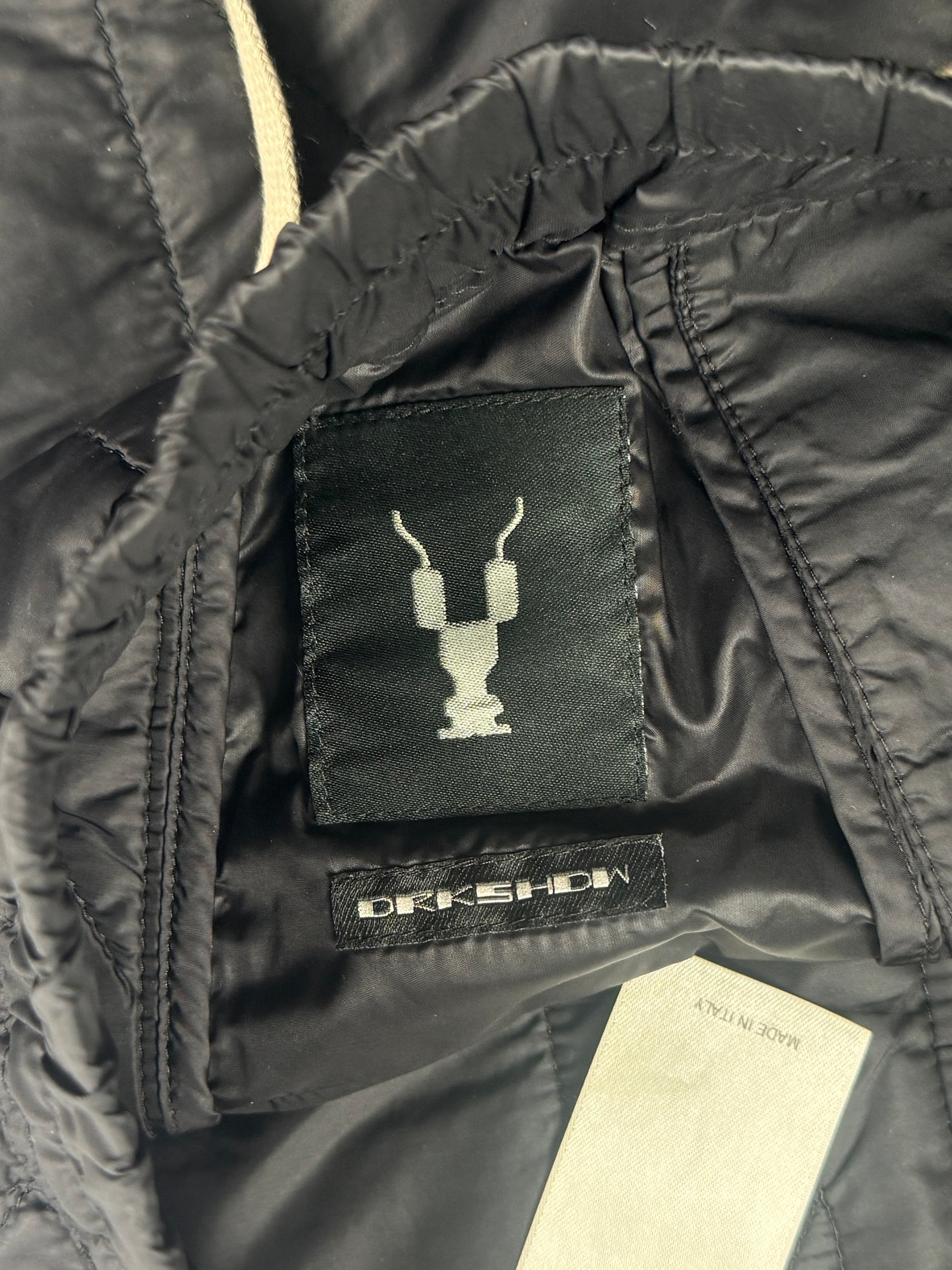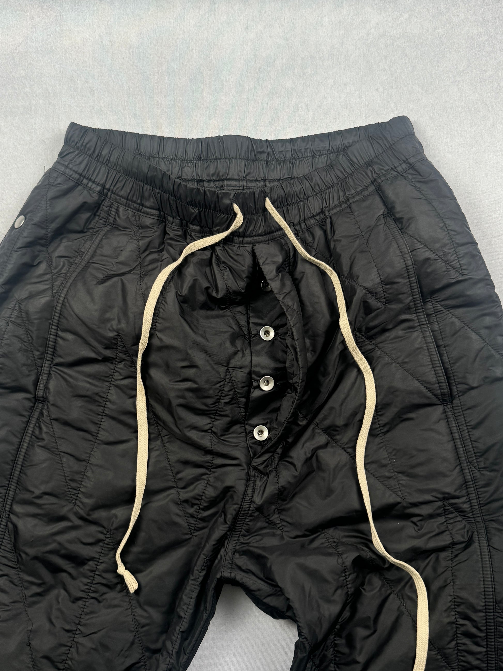 DRKSHDW Easy Pusher Pants in black, cut from Rick Owens’ NZ quilted nylon. - A technical iteration of the classic Pusher silhouette that emphasizes craftsmanship and structural design.